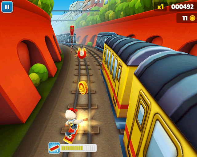 There is a cool power-up named as Hoverboard which will make you invisible for short interval. In Subway Surfers if you hit the train then the policeman and his dog will chase after you and from there if you make a mistake again then he will catch you and send you back to the start. You can use the coins you collect during the game to purchase one time power-ups. Have fun playing Subway Surfers game.